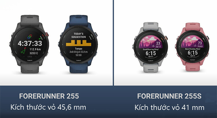 Forerunner 255 sở hữu thiết kế đẹp mắt với hai kích thước khác nhau: 255 tiêu chuẩn có vỏ đồng hồ 26 mm và nặng 49g trong khi 255S nhỏ hơn có vỏ đồng hồ 41 mm, dày 12,4 mm và trọng lượng 39g sẽ cho bạn cảm giác nhẹ nhàng trên cổ tay khi hoạt động.