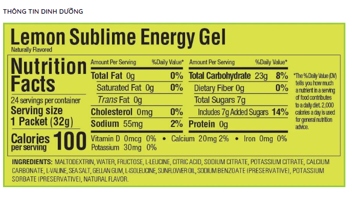 - Gel GU kết hợp maltodextrin và fructose – hai loại carbohydrate cung cấp năng lượng nhanh chóng và kéo dài, giúp giảm áp lực lên hệ tiêu hóa và ngăn chặn cảm giác khó chịu dạ dày.